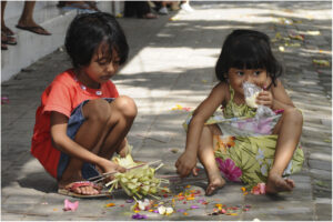 02-Michel-GLes enfants confectionnent, pour honorer les dieux , des offarndes déposées partout dans le village.