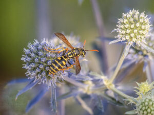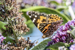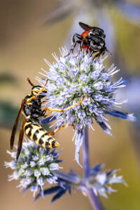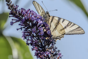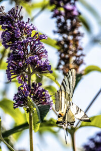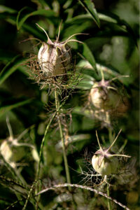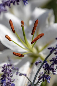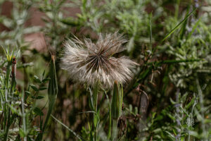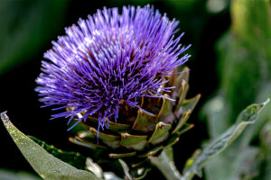 G-EXP-2025-08-Jardins familiaux du Trou du Loup Jean-Loiuios B :Artichaud en fleur, Trou du Loup Jean-Louis B : Lys blanc, Trou du Loup Jean-Louis B : Nigella damascena (Nigelle de Damas), Trou du loup Jean-Louis B : Trou du Loup